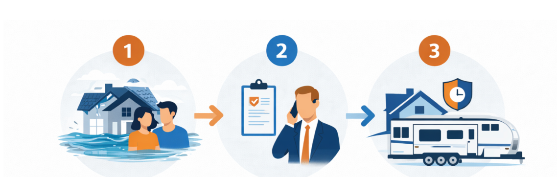 A fully set-up and outfitted temporary dwelling is delivered to your property. Available and supported for the duration of repairs.